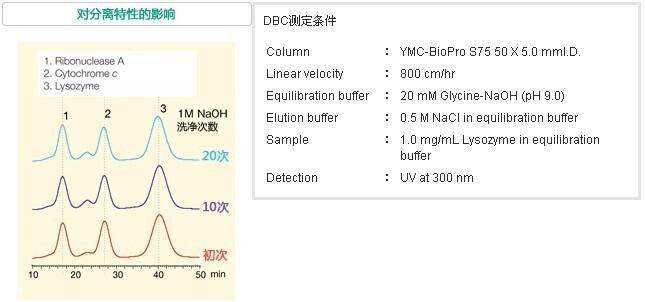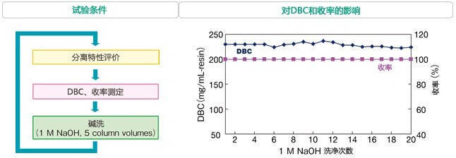 對于蛋白質純化用色譜柱的清洗/殺菌常采用堿性溶液進行定位清洗的方法(CIP:cleaning in place)。YMC-BioProl離子交換填料因為具有卓越的耐堿性,所以即使使用1M NaOH實施20次的CIP也能維持高DBC和收率,而不會發(fā)生分離特性的改變。