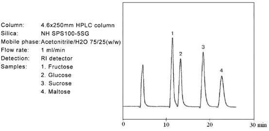 糖類的分離通常用到的是乙腈/水做流動相。當乙腈的含量增加,保留因子k’增加。但是乙腈的含量需要仔細的控制,因為隨著乙腈含量的增加,樣品的溶解性會變差。