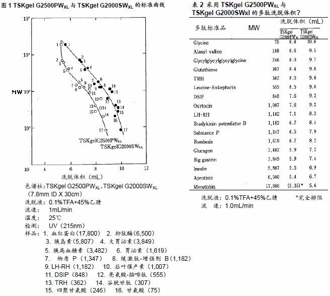 ??? 表2所示為各多肽標(biāo)準(zhǔn)液的洗脫體積,圖1所示為標(biāo)準(zhǔn)曲線。洗脫液采用含有45%乙腈的0.1%TFA溶液。所有TSKgel G2000SWXL的樣品洗脫速度均慢于TSKgel G2500PWXL。同時(shí),在TSKgel G2000SWXL中,肌球蛋白(MW17800)進(jìn)入填充劑的小孔內(nèi)部,但在TSKgel G2500PWXL中,肌球蛋白被小孔排阻,從外水體積中被洗脫。根據(jù)其結(jié)果,可認(rèn)為TSKgel G2500PWXL在上述洗脫液條件下的多肽分子量排阻界限推測(cè)為8000,相比之下,硅膠型填充劑TSKgel G2000SWXL,可適用于從低分子量到高分子量區(qū)域更廣的范圍。