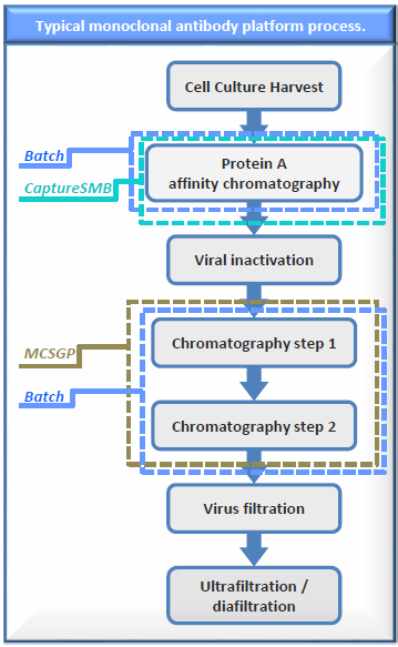 層析系統,已由2004年的6-8柱位設計、2006年的3柱位設計,發展為最優化的2柱位設計,可運行多種層析模式,如標準批處理過程、Capture SMB、MCSGP(多柱逆流溶劑梯度純化)、N-Rich等,實現了層析新技術與層析系統軟硬件設計的完美結合,使得設備成本更低,構造更為簡化,并可使層析填料、緩沖液等成本投入大為節省,同時也使得純化周期大為縮短。