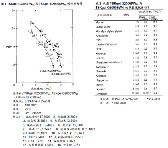 一般情況下,采用GFC法分離多肽所使用的填充劑多為TSKgel的SW硅膠型填料而非TSKgel的PW樹脂型填料。本文中將針對這些填充劑(TSKgel G2000SWXL以及TSKgel G2500PWXL)在多肽分離的應用上進行探討。