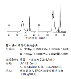 圖4所示為分離基因重組ProteinA的TRCK-胰蛋白酶消化物的實例。樣品中含有與蛋白質消化物分子量不同的各類多肽。如上所示,由于TSKgel G2000SWXL色譜柱的分離范圍較寬,其分離效果也更好。(該樣品通過RPC分析的結果,可觀察到約有60種多肽峰在RPC下被檢測到)。