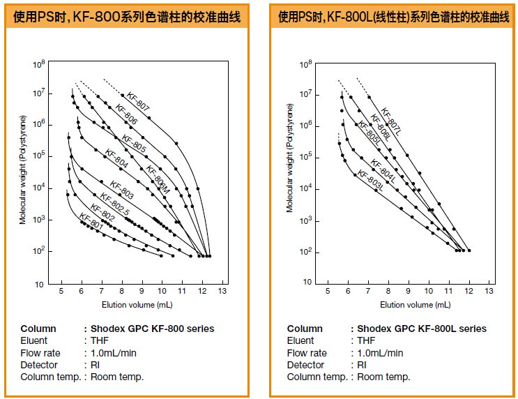 GPC KF-803是標(biāo)準(zhǔn)的油溶性SEC色譜柱,適用于從低分子量到高分子量的寬范圍的樣品。流動(dòng)相是THF。